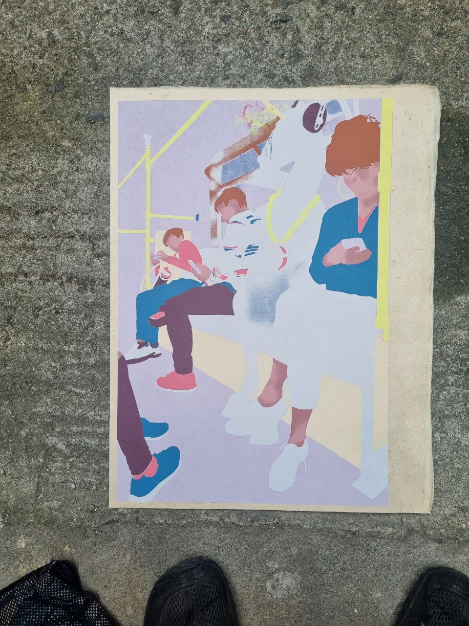 MB Hm .. also das Wichtigste zum Drucken ist, dass es nicht zu dünn, nicht zu empfindlich ist, weil ich wasserbasierende und keine lösemittelbasierte Farben habe. Das heißt, wenn’s zu dünn ist oder die Laufrichtung vom Papier nicht stimmt, dann verzieht sich das oder wellt sich. Verziehen ist ein Problem. Wenn du die erste Farbe gedruckt hast, kann es passieren, dass das Papier danach einen halben CM größer ist und dann passen die nächsten Farben nicht mehr drauf. Kann halt passieren. Ist bei dem [200g Kuhiro Paper] aber auch kein Problem.